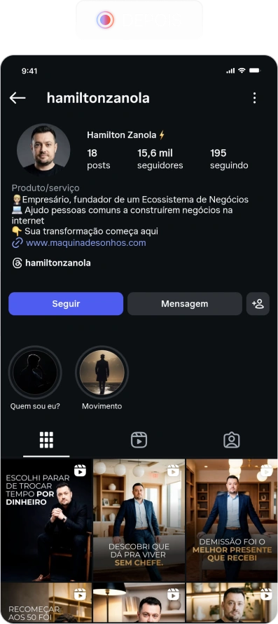 Esse projeto é a prova de que as maiores histórias de vendas nascem da dor real. Hamilton passou 25 anos subindo na hierarquia de uma multinacional até virar diretor. Foi descartado, entrou em depressão profunda e foi parar na UTI. A filha de 9 anos disse: “Pai, se for demitido, vai destruir meu sonho.” Dias depois, estava demitido.